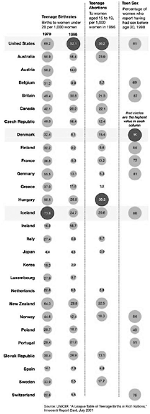 Figuur 34: Vergelijkende tabel met gegevens over geboorte en seks bij tieners in rijke landen. Bron: Gegevens uit Innocenti Report nummer 3 van Unicef, juli 2001. De tabel komt uit de New York Times van 6 september 2008 uit een artikel van Charles M. Blow “Let’s talk about sex”.