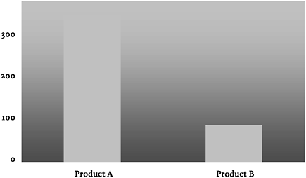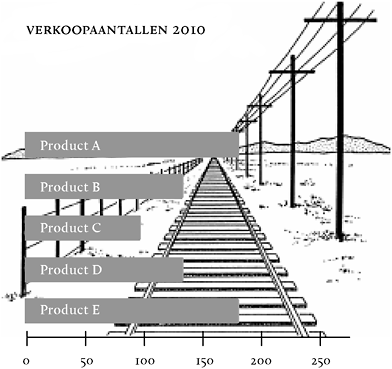 Ook het gebruik van de achtergrond levert een scala aan manipulerende effecten op. Zie bijvoorbeeld figuur 36. De verkoopaantallen voor Product A lijken hoger dan die van Product E. Toch zijn beide staven even lang. Daarnaast lijkt Product B weer minder goed verkocht dan Product D, maar ook dit is gezichtsbedrog. Beide producten werden evenveel verkocht in 2010.