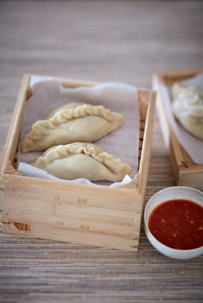 8. Die Teigtaschen (Momos) auf Backpapier legen und am besten in zwei große Bambus-Dämpfkorbe legen.