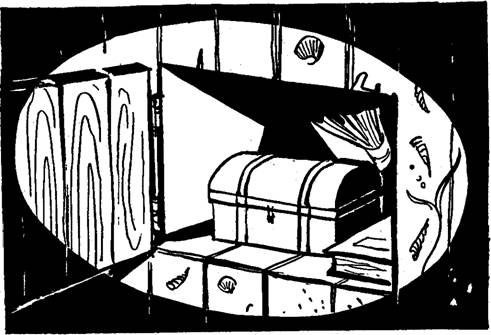 Ils arrivèrent enfin à une cabine plus vaste que les précédentes. Dans un coin, ils aperçurent une couchette : un crabe énorme l’occupait. Quelques vestiges de mobilier subsistaient : ce qui semblait avoir été une table s’appuyait contre la couchette. Mais à présent la table en question ne possédait plus que deux pieds et était tout incrustée de coquillages. Des étagères de bois, décorées de festons d’algues, s’accrochaient encore piteusement aux parois de la cabine.