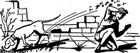 Une brève seconde, le petit animal demeura comme figé sur place. On ne l’avait jamais effrayé ni poursuivi auparavant et il contempla avec des yeux exorbités l’énorme monstre qui lui fondait dessus. Soudain, comprenant le danger, il se mit à fuir, sa queue minuscule dressée comme un signal de détresse, et disparut au sein d’un gros buisson, tout à côté des enfants. Dagobert se rua après lui et disparut à son tour.