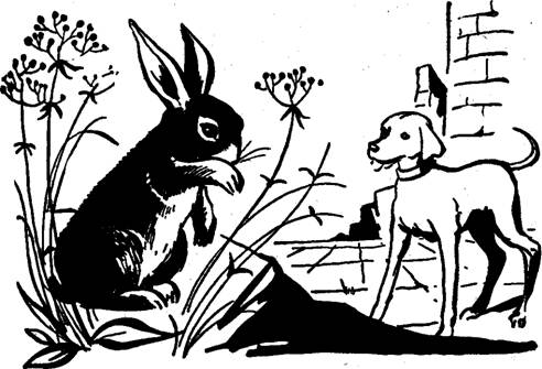 C’en fut trop pour le pauvre Dagobert. Il avait vaillamment résisté à la tentation, se contentant d’un bref aboiement lorsque les deux premiers lapins avaient fait leur apparition. Mais ce lapereau, arrêté presque sous son nez et en train de se débarbouiller sans même faire attention à lui, constituait un défi qu’aucun chien digne de ce nom n’aurait pu ignorer. Dago, sans crier gare, poussa un « Ouah ! » formidable et se précipita sur le lapin surpris.