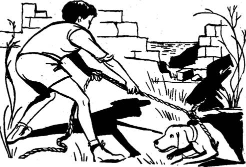L’exaltation des enfants était à son comble. Tous essayèrent, chacun à son tour, de tirer sur l’anneau de fer, mais la pierre se refusa à bouger. Alors François attacha solidement à l’anneau l’extrémité d’une corde et les quatre compagnons se mirent à haler celle-ci de toutes leurs forces réunies.