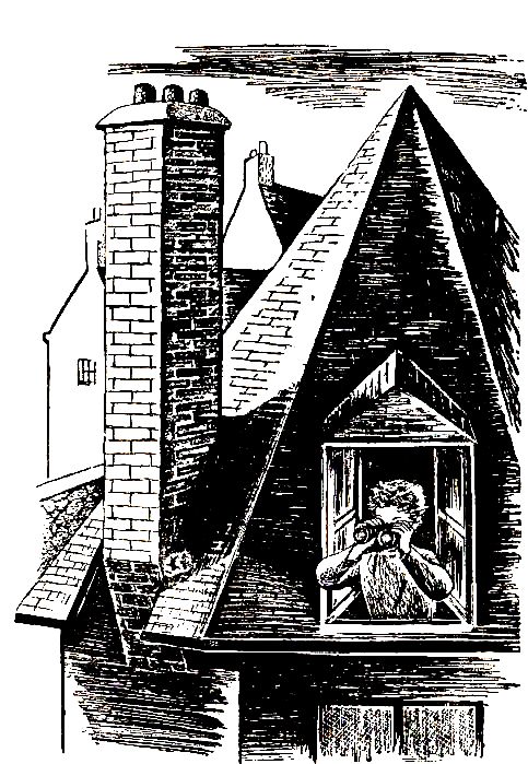 Les jumelles étaient accrochées dans le hall. Claude les extirpa de leur gaine et grimpa l’escalier au pas de course. Mais elle redescendit bientôt, l’air désappointé.