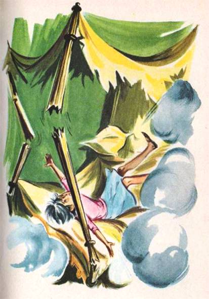 Et, sans hésiter, elle grimpa sur le vaste lit à colonnes surmonté d’un grand baldaquin qui tombait en lambeaux. Dans un craquement retentissant, la couche céda, le baldaquin s’effondra et la fille disparut dans un nuage de poussière. Le lit fabuleux s’était littéralement écroulé… Pauvre Annie !