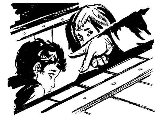 En se dirigeant vers l’endroit indiqué, Emilio passa devant le coffre qui dissimulait Claude et Annie. Craignant d’être découvertes, elles se recroquevillèrent sur le sol. Hélas ! L’homme avait l’œil perçant; il lui sembla voir bouger quelque chose. Il s’arrêta. Qu’est-ce donc qui venait de remuer ?… Un pied !