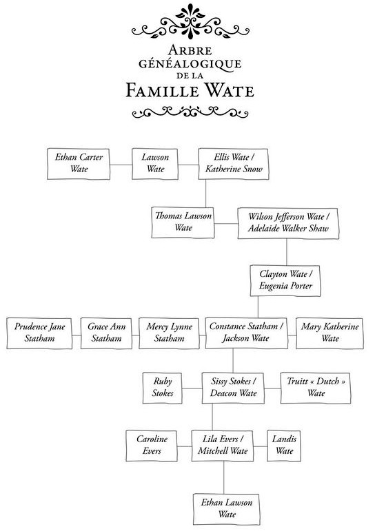 Aujourd’hui, cependant, je me suis rué sous la douche avant qu’Amma n’ait lancé son troisième appel. J’avais hâte de me rendre chez mes tantes. Nul ne leur était étranger de ceux qui avaient vécu à Gatlin. Normal, vu qu’à elles trois, elles avaient eu, de par leurs unions respectives, des liens de famille avec la moitié de la population. Simultanément ou successivement. Après ma vision, je n’avais eu aucun mal à déduire que le G des initiales GKD voulait dire Genevieve. Si quelqu’un devait savoir quels noms recouvraient les autres lettres, c’étaient bien les trois plus vieilles femmes de Gatlin.