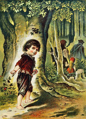 Am frühen Morgen kam die Frau und holte die Kinder aus dem Bette. Sie erhielten ihr Stückchen Brot, das war aber noch kleiner als das vorherige Mal. Auf dem Wege nach dem Wald bröckelte es Hänsel in der Tasche, stand oft still und warf ein Bröcklein auf die Erde. »Hänsel, was stehst du und guckst dich um?«, sagte der Vater, »geh deiner Wege!«