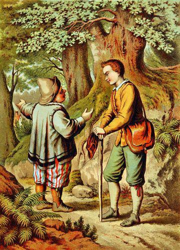 Der dritte Bruder war zu einem Drechsler in die Lehre gegangen, und weil es ein kunstreiches Handwerk ist, musste er am längsten lernen. Seine Brüder aber meldeten ihm in einem Briefe, wie schlimm es ihnen ergangen wäre und wie sie der Wirt noch am letzten Abend um ihre schönen Wünschdinge gebracht hätte. Als der Drechsler nun ausgelernt hatte und wandern sollte, so schenkte ihm sein Meister, weil er sich so wohl gehalten, einen Sack und sagte: »Es liegt ein Knüppel darin.«