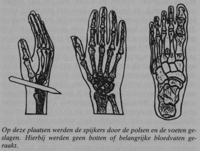 Aan de hand gaat de spijker midden door de acht handwortelbeentjes en duwt die juist een eindje uit elkaar. De doorboring van de voeten ligt in het ‘tweede metatarsale specium’ en heeft hier ‘slechts’ vleeswonden veroorzaakt.