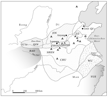 583 v. u. Z. war Chu so mächtig geworden, dass sich der Staat Jin entschloss, Bündnisse mit anderen Man-Völkern zu schließen, um Chu in die Zange nehmen zu können. 506 v. u. Z. war einer der Verbündeten, der Staat Wu, stark genug, um das Heer von Chu vernichtend zu schlagen; und 482 v. u. Z. schließlich musste der Markgraf von Jin seinen Status als ba an den Vizegrafen Fuchai von Wu übergeben – der prompt ebenfalls seine Abkunft von den Zhou erklärte. Nun aber |243|stieg ein anderer Staat des Südens auf: Yue wurde zur führenden Macht. Seine Vizegrafen versuchten, Wu ideologisch zu übertrumpfen, und behaupteten ihre Abkunft von der ältesten aller Dynastien, nämlich von den Xia. Nach 473 v. u. Z., nachdem sich Vizegraf Fuchai von Wu erhängt hatte (während der Belagerung seiner Hauptstadt durch das Heer von Yue), übernahm der Vizegraf von Yue dessen Stellung als ba. Trotz aller politischen Zersplitterung hatte sich das östliche Kerngebiet nicht weniger dramatisch vergrößert als das westliche.