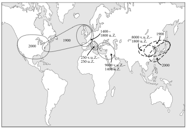 Die mal langsame, dann wieder rasche Verlagerung der höchstentwickelten Kerngebiete innerhalb des westlichen (gepunktet) und des östlichen (gestrichelt) Kulturkreises seit dem Ende der Eiszeit.