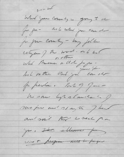 Ik herinner me dat hij zijn toespraak schreef in Florida.[201] Weet je, al die gele blaadjes die hij dan binnenbracht en dan las hij een deel voor en kraste delen door. Ik heb hem het hele ding nooit voor horen lezen tot op Inauguratiedag, maar van ieder deel herinner ik me dat ik het eerder gehoord had. We hadden die kleine slaapkamer in Florida en er waren zoveel mensen in andere delen van het huis... Ik lag het grootste deel van de tijd in bed. Dan kwam Jack binnen met zijn sigaar, weet je, paffend, met een dik blok gele vellen en dan zat hij... ging hij op de rand van mijn bed zitten en dan las hij me een paar dingen voor die hij had geschreven en dan sloeg hij ze om, krabbelde er wat bij en dan stapelde hij het op zijn bureau op, dat gewoon overstroomde van de vellen papier, en overal in die kamer lag papier. Dan ging hij weg om met iemand te praten of soms om te golfen. Hij was toen zo gelukkig... hij zag er zo goed uit, weet je, dat was een heel gelukkige tijd voor hem.