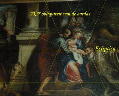 Er valt nog iets bijzonders te ontdekken in bovenstaand schilderij. Gary Osborn (www.freewebs.com/garyosborn/235degrees.htm) heeft namelijk ontdekt dat in christelijke kunstuitingen vaak de obliquiteit van de aardas gecodeerd is. De obliquiteit van de aardas is de hellingshoek die de aardas maakt met een as loodrecht om het omloopvlak van de aarde om de zon, de ecliptica. Aan deze hellingshoek van 23,5° dankt onze planeet haar seizoenen.