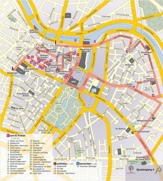 Unter dem Eindruck der zweiten Villa Kunterbunt gelangen wir durch das unspektakulär-graue Alltagsleben von Radetzkyplatz und -straße wieder in die Innere Stadt. Hinter der Zentrale des Wiener Rettungswesens passieren wir die Radetzkybrücke über die Mündung der Wien in den Donaukanal. Direkt dahinter erhebt sich rechterhand das strahlend weiß getünchte städtische Volksbildungshaus → Urania, das planmäßig ab 2012 mittels einer Klappbrücke nach Entwürfen der Londoner Architekten Krolikowski & Schmitt direkt an das Ufer des Donaukanals angebunden wird. Dass der künftige „connecting link“ (so der Titel des Architekturwettbewerbs) für Fußgänger und Radfahrer beweglich sein wird, verlangen die Donaukanalschiffe, die in der Sommersaison bis zu 15-mal täglich in der Flussmündung wenden. Zwei von ihnen liegen wenige Meter weiter dauerhaft vor Anker und werden seit einigen Jahren als beliebter Gastronomie- und (Frei-)Badebetrieb zweckentfremdet. Das Badeschiff liegt zwischen Urania und dem quirligen Nahverkehrsknotenpunkt Schwedenplatz, von wo man per U-Bahn oder pedes (via Rotenturmstraße) in wenigen Minuten den Ausgangspunkt Stephansplatz erreicht. Gleich dahinter tut sich übrigens seit Sommer 2010 das „Gate to Bratislava“ auf. Gemeint ist das nagelneue Schiffsterminal zwischen Marien- und Friedensbrücke, von dem seither die Twin City Liners nach Bratislava starten und in dem das Motto am Fluss, ein im venezianischen Stil der 1950er Jahre gehaltener Gastronomiebetrieb, Quartier bezogen hat.