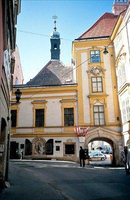 Neben einem Alt-Wiener Gasthaus, das in Erinnerung an diese Ereignisse Zum Basilisken (Schönlaterngasse 3–5) heißt, tauchen wir durch einen Torbogen in die Ruhe und Beschaulichkeit des → Heiligenkreuzerhofes ein. Der um einen malerischen Innenhof gruppierte Gebäudekomplex der früheren Klosteranlage wuchs in der Mitte des 18. Jh. und wird heute gewerblich und gastronomisch genutzt. Wir verlassen ihn via Köllnerhofgasse, deren Namen an den hier einst angesiedelten Handelssitz Kölner Kaufleute erinnert, und erreichen eine Straße namens Fleischmarkt, an der sich im 18. Jh. bevorzugt deren griechische Berufskollegen niederließen. Davon zeugen die 1861 erbaute, von Theophil von Hansen entworfene Griechisch-Orientalische (Orthodoxe) Metropolitankirche Zur Heiligen Dreifaltigkeit direkt am Fleischmarkt und die Griechisch-Orthodoxe Kirche St. Georg in der idyllischen Griechengasse gleich um die Ecke. Zwischen beide Gotteshäuser, die heute 10.000 griechischstämmige Wiener zum Gebet rufen, klemmt sich das Griechenbeisl, in dem so berühmte Persönlichkeiten wie Beethoven, Brahms, Grillparzer oder Nestroy gegessen und gezecht haben sollen.
