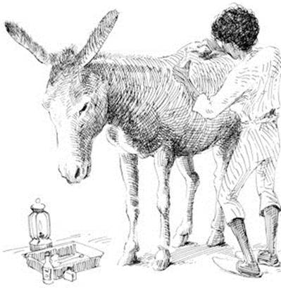 « Ayant parlé ainsi, M. Evans a fait sortir deux mulets peu malades d’une écurie et nous y avons mené le petit âne en le soutenant chacun de notre côté. Au plafond était fixée une barre très solide, à laquelle pendait une sangle ouverte. Je l’ai passée sous le ventre du petit âne et je l’ai ajustée sur lui, de façon à ne pas toucher son échine à vif. Il pouvait alors rester debout sans fatigue, parce qu’il était comme suspendu dans l’air. Pour tout cela je ne faisais que suivre, vous le pensez bien, les ordres de M. Evans.