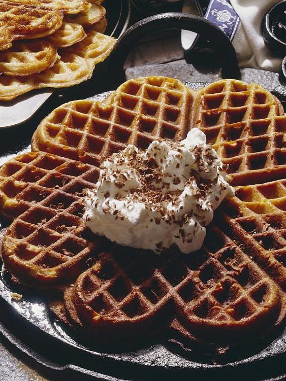 Tipp: Zum Warmhalten der Waffeln am besten auf einen Teller stapeln und im auf 80 °C vorgeheizten Backofen zwischenlagern. Wenn Sie die Waffeln aufbewahren möchten, lassen Sie sie nebeneinander liegend auf einem Kuchenrost abkühlen, damit sie nicht weich und matschig werden.