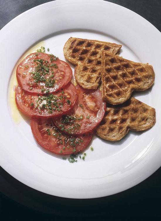 3 Die Tomaten waschen, vom Stielansatz befreien und in schmale Scheiben schneiden. Das Öl mit dem Essig verrühren, salzen, pfeffern und abschmecken. Die Tomatenscheiben auf Teller anrichten, mit Schnittlauchröllchen bestreuen und mit der Vinaigrette beträufeln. Die Waffeln daneben legen und servieren.