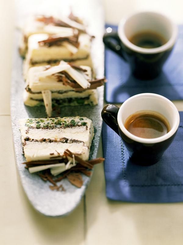7 Die Kaffeesahne steif schlagen und zusammen mit dem Eischnee unter die Creme heben. Ca. 1/3 der Creme in die Form füllen und glatt streichen. Einen Biskuitboden mit der Schokoladenseite nach oben darauf legen. Mit einem weiteren Drittel der Creme bestreichen und den zweiten Biskuitboden darauf legen. Die restliche Creme mit den Pistazien mischen und in die Form füllen. Mit der Frischhaltefolie einschlagen und mindestens 4 Stunden in den Tiefkühler stellen.
