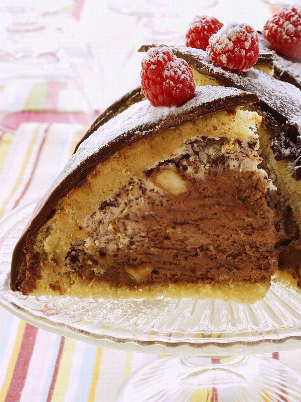 7 Den Kuchen 1 Stunde vor dem Servieren aus dem Kühlschrank nehmen. Die Frischhaltefolie von der Oberfläche entfernen, den Kuchen auf eine Platte stürzen. Die Schüssel und die Folie vorsichtig entfernen.