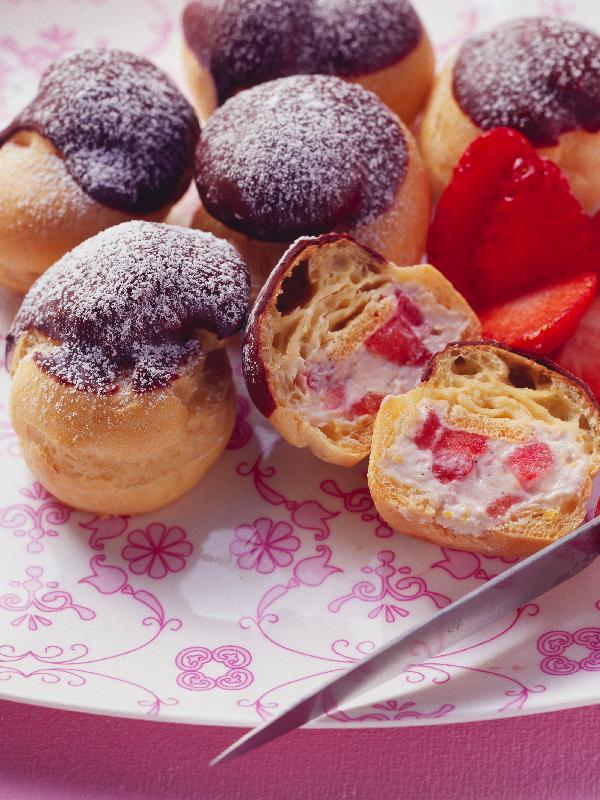 6 Zum Füllen die Erdbeeren waschen, putzen und in kleine Stücke schneiden. Die Mascarpone mit dem Quark, Zucker und Zitronenabrieb gut verrühren und die Erdbeeren unterheben. Die Profiteroles damit füllen.