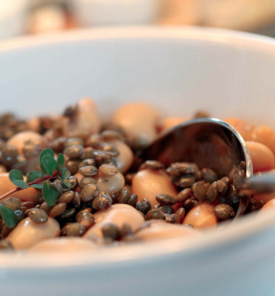 Linsen mit Gemüsebrühe in einem Topf aufkochen und bei geringer Hitze köcheln lassen, bis die Linsen gar, aber noch bissfest sind (etwa 20–30 Min.). Restliche Flüssigkeit abgießen, Linsen mit den Bohnenkernen in einer Salatschüssel vermischen, etwas salzen.