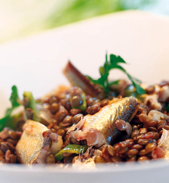 Fisch in grobe Stücke zupfen und vorsichtig unter die Linsen heben. Grob gehackte Petersilie in den Salat geben und mit Salz, Pfeffer und Sherryessig abschmecken.