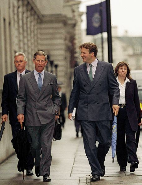 Charles op 16 september 1999 met zijn pr-goeroe Mark Bolland, bijgenaamd ‘Lord Blackadder’, op weg naar de uitreiking in de Reform Club in Londen van de Guild of Health Writers Award voor professionaliteit in de geïntegreerde gezondheidszorg. Tim Graham/Getty Images
