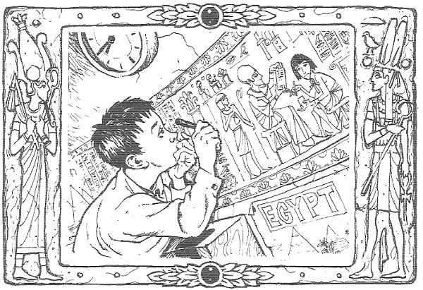 Thomas keek op zijn horloge. Hij had genoeg tijd voor nog een figuurtje. Het was waarschijnlijk veel erger om in de Egyptische Oudheid te leren schrijven, want toen hadden ze honderden verschillende tekens! Hij keek langs de muur naar de schildering van een jongen die leerde schrijven, met naast hem een leraar. Het was de eerste keer dat Thomas dat stukje zag, want juffrouw Marjan was gisteren pas begonnen met het natekenen. Ze had er waarschijnlijk na de les nog het een en ander aan gedaan.