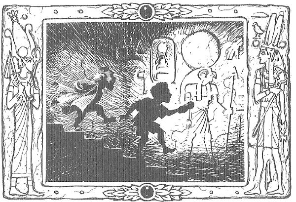 Ze waren nu in een voorvertrek van de grafkamer, vol met dingen die nuttig konden zijn voor een leven na de dood. Er waren potten en kruiken van goud en koper, beelden van ebbenhout en ceder, meubelstukken, eten en drinken, amuletten, kettingen, juwelen en waardevolle stenen. Elke centimeter van de muren en het plafond was beschilderd. Figuren, dansend, zittend en staand, straalden levendig van de wanden.