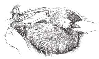 Figure 19. Scrub mold off with a vegetable scrubbing brush under running water. Hams aged more than six months should be soaked. Scrub ham again after soaking.