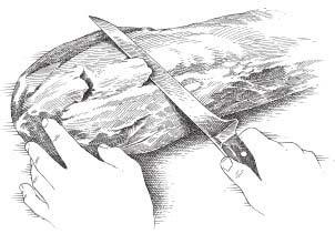 Figure 33. To keep the meat from bowing as it cooks, slide a knife under the silver skin and flick the blade upward to cut through the silver skin at five or six spots along the length of the roast.