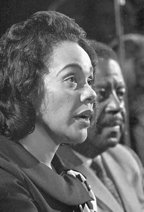 Coretta spricht bei einer Pressekonferenz am 6. April 1968 über die Arbeit ihres Mannes und die Aussichten auf deren Weiterführung. Neben Mrs King ist Pastor Ralph Abernathy zu sehen. (AP Photo/Charles E. Knoblock) |