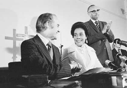 Coretta schüttelt Senator George McGovern bei einer Pressekonferenz in Los Angeles die Hand, wo sie seine Bewerbung um die Nominierung als Präsidentschaftskandidat der Demokraten unterstützt (re.: Pastor Tom Kilgore; AP Photo). |