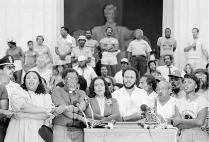 Oben: Coretta steht zwischen ihrem Sohn Martin Luther King III. (rechts von ihr) und Pastor Lowery, Vorsitzender der SCLC. Sie singt die Bürgerrechtshymne „We shall overcome“ nach einer Massenkundgebung auf den Stufen des Lincoln Memorial in Washington, D.C., am 27. August 1983. (AP Photo/Ira Schwarz) |