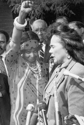 Winnie Mandela beim „Black Power-Gruß“, als Coretta King während ihres Besuchs bei den Mandelas in Soweto, Südafrika, am Donnerstag, dem 11. September 1986, zu den Medienvertretern spricht. (AP Photo / Greg English) |