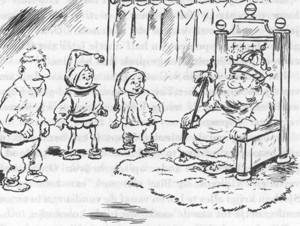 Nauwelijks is de kolenkabouter uitgesproken, of daar komt de koning al aanstappen. Ook hij is helemaal in het zwart gekleed en hij is even stoffig en vuil als de andere kabouters. Het enige verschil is, dat hij op zijn hoofd een klein kroontje draagt in plaats van een puntmuts.