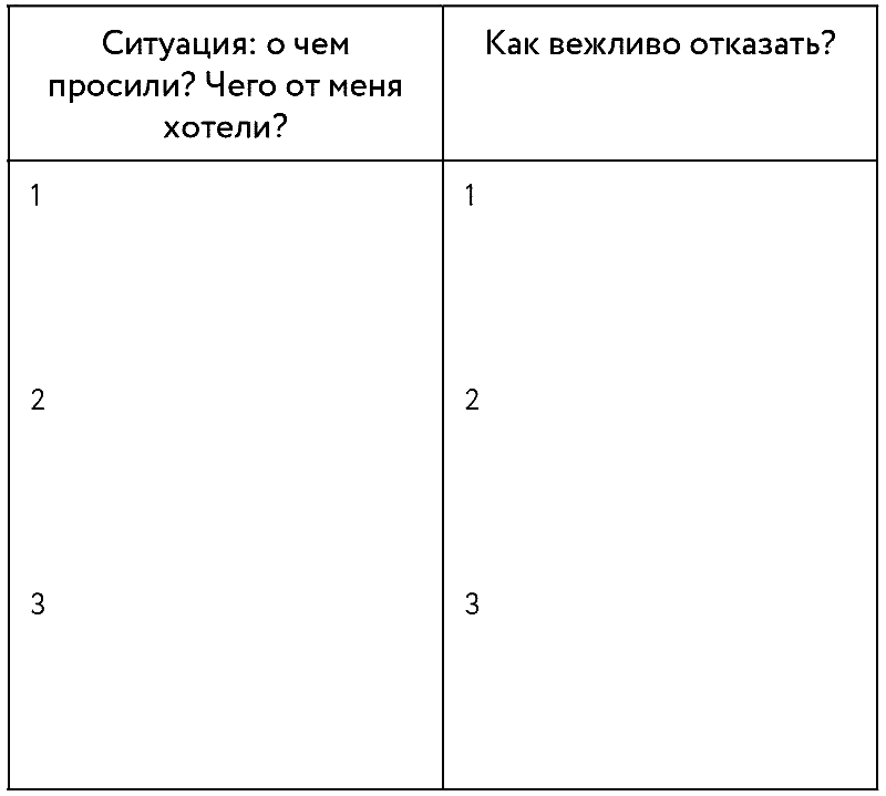 Говорят, что мы все крепки задним умом. Отчасти это так, и остроумные ответы приходят в голову порой слишком поздно. Но давайте попробуем смоделировать несколько ситуаций, которые могут произойти (вернее, уже происходили) в вашей жизни. Перед вами специальная страничка с таблицей, где вам предлагается вписать несколько ситуаций, когда вами манипулировали, пытались заставить сделать нечто выгодное другим. Например, кто-то из сослуживцев третий раз подряд старается надавить на вас, чтобы вы вместо него отработали в выходной. Как вы ответите ему? Как отстоите свои интересы? Впишите свой вариант ответа. Он не должен выглядеть как обман или оправдание, не стоит говорить: «Ой, извини, не могу, ко мне в выходные приезжает тетя из Петропавловска-Камчатского». Просто и с достоинством скажите: «Нет, не могу. Я уже достаточно шел тебе навстречу, и на эти выходные у меня намечены другие планы». Вспомните еще несколько подобных случаев и впишите в табличку варианты ответов. Можете в дальнейшем использовать эти «заготовки» в аналогичных ситуациях.