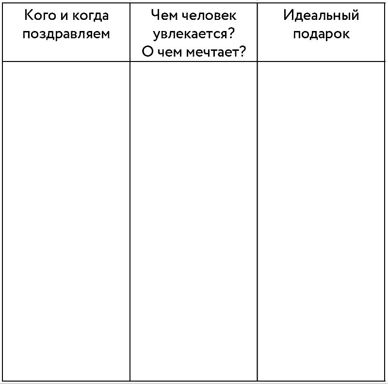 Хороший повод подумать об окружающих – день рождения или любой другой праздник. К сожалению, ритм нашей жизни не всегда позволяет покупать подарки заранее и делать их продуманными, так исправим же этот недостаток! Вспомните, у кого из ваших родных и друзей будут в ближайшие несколько месяцев дни рождения. Затем заполните таблицу, которая позволит вам заранее подготовить подарки для своих близких, сделать их еще более личными и душевными! Обратите внимание: в таблице отдельная графа предназначена для того, чтобы вы вспомнили все особенности характера человека, которому предназначается подарок. И когда пойдете за покупками к празднику, не отступайте от плана! Такие продуманные подарки укрепят вашу репутацию внимательного и дружелюбного человека. Приятно будет всем!