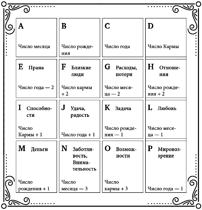 Считается, что мантра – это звуковое тело, а янтра – физическое тело. Когда мы говорим о нумерологической янтре, мы подразумеваем квадрат, разделенный на шестнадцать квадратиков поменьше и заполненный цифрами. Янтру нужно рисовать от руки. Цвет чернил, которыми мы рисуем, должен соответствовать интегральному числу – об интегральном числе вы прочтете ниже, а пока просто примите это к сведению!