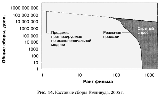 Это относится не только к интернет-продавцам книг; это пример совершенно новой экономической модели для СМИ и индустрии развлечений — модели, которая только начинает показывать свою силу. Неограниченный выбор демонстрирует, чего хотят потребители и как они хотят это получить — от DVD в Netflix, сдающей их в прокат по почте, до скачивания песен в iTunes и Rhapsody. Люди углубляются в каталог и проходят по списку значительно дальше, чем возможно в пунктах проката Blockbuster Video и музыкальных магазинах Tower Records. Чем больше они там находят, тем больше им нравится. Сходя с проторенного пути, они обнаруживают, что их вкусы не такие обычные, как им казалось раньше (или как их убедили маркетинг, основанная на хитах культура и отсутствие альтернатив).