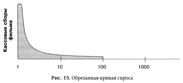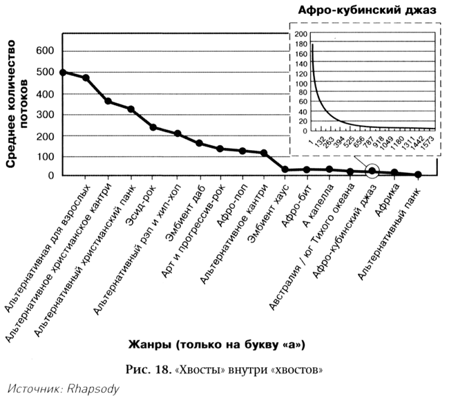 Она начиналась как любая другая кривая спроса, ранжированная по популярности. В ее начале несколько хитов были скачаны большое количество раз, а затем кривая резко падала вниз. Что интересно, она никогда не опускалась до нуля. Если взглянуть на стотысячную композицию, становится ясно, что за месяц ее скачали тысячи раз. А кривая продолжалась: 300, 400, 500 тыс. — ни один магазин не может позволить себе держать столько записей… Однако как бы далеко я ни заглядывал, спрос сохранялся. В самом конце кривой композиции скачивались всего по четыре-пять раз в месяц, но это все равно не ноль…