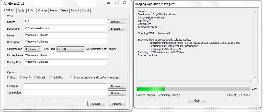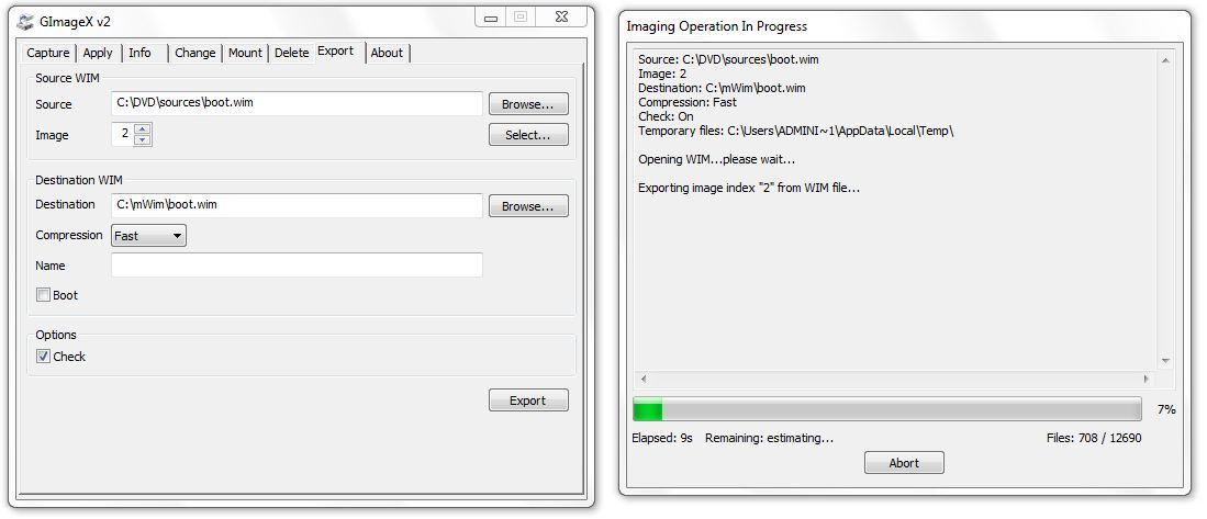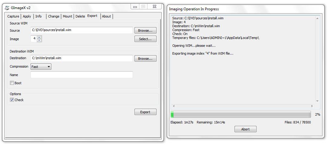 3) При помощи GimageX экспортируете из папки \Sources\install.wim в папку D:\mWim образ Ultimate (индекс 5 для 32-битных версий или Индекс 4 для 64-битных версий) как install.wim